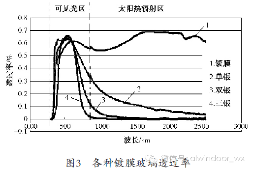 分析图2、图3可知,与普通玻璃相比,镀膜玻璃在近红外波段内的透过相应减少,且从单银到双银再到三银明显减少,从而阻挡热辐射。尤其是三银Low-E玻璃,具有高的可见光透过率,从而保证了高的采光性,同时具有最低的近红外透过率,从而有效地阻挡了热辐射。