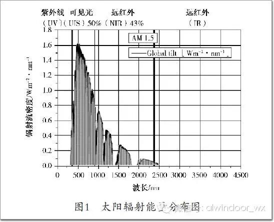 如图1所示,太阳辐射主要集中在可见光部分(380~780nm),波长大于可见光的红外线(>780nm)和小于可见光的紫外线(<380nm)的部分较少。在全部辐射能中,波长在150~4000nm的占99%以上,且主要分布在可见光区和红外区,前者占太阳辐射总能量的约50%,后者占约43%,紫外区的太阳辐射能很少,只占总量的约7%。