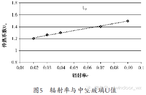 图5是以4 mm Low-E玻璃+12 mm间隔框充90%氩气+4 mm白玻的Low-E中空系统的Ug值与辐射率关系的实测图: