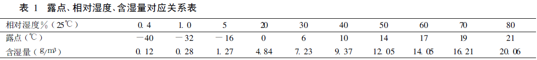 结露的定义是表面温度低于附近空气露点温度时, 结构表面出现冷凝水的现象。结露的关键是湿空气露点温度, 中空玻璃的露点是指密封于空气层中的空气湿度达到饱和状态时的温度, 当面层温度低于该温度时, 空气层中的水汽便会在玻璃内表面结露或结霜(玻璃内表面温度高于0℃时为结露, 低于0℃时为结霜)。露点与空气中的含湿量和相对湿度有一一对应关系, 含湿量越高, 露点的温度也越高。见表1。