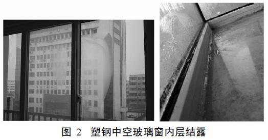 国家标准GB11944-2002《中空玻璃》规定中空玻璃的露点为-40℃, 按照此规定, 建筑用塑钢中空玻璃窗在日常使用中应不会出现内层结露或结霜问题, 出现这种现象的原因可归结为内层空气层露点上升。而中空玻璃空气层露点上升的原因主要是由于外界的水分进入空气层而又不被干燥剂吸收所造成的。具体来说, 有以下三种原因可导致中空玻璃露点上升。