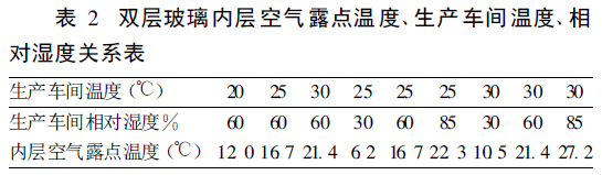 适当选择干燥剂的吸附速率, 合理的包装运输,较小玻璃的破损等都是一些很有效的措施。另外, 需要着重指出的是, 目前市场上存在以双层玻璃顶替中空玻璃的现象, 甲方使用时发现有内层结露失效现象, 双层玻璃内层结露的原因与上述中空玻璃内层结露原因不同。双层玻璃一般采用双面贴或其它方法, 将两片预先划裁好的玻璃间隔一定距离, 然后进行粘结固定, 后进行二道胶密封, 构成双层玻璃窗。这种窗内层结露的原因是由于双层玻璃内层没有干燥剂吸附水分, 致使密封于玻璃内层的空气相对湿度与生产车间的相对湿度相同, 湿度较高, 露点较高, 极易结露。若双层玻璃密封严实, 则双层玻璃内层空气的露点温度与生产车间的温湿度一一对应(见表2)。