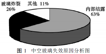 据国内对使用两年后的中空玻璃进行调查, 中空玻璃的失效率为3% ~ 5%, 造成失效的原因一是中空玻璃空气层内露点上升, 内部结露(见图2), 占63%;二是中空玻璃炸裂, 占26%, 这两种原因构成了总失效的89%, 其余的只占11%。从图1中可以看出, 中空玻璃空气层内部结露问题突出, 不仅影响其透湿度, 并降低中空玻璃的隔热效果, 必须引起高度重视, 分析原因, 采取一定的控制措施。